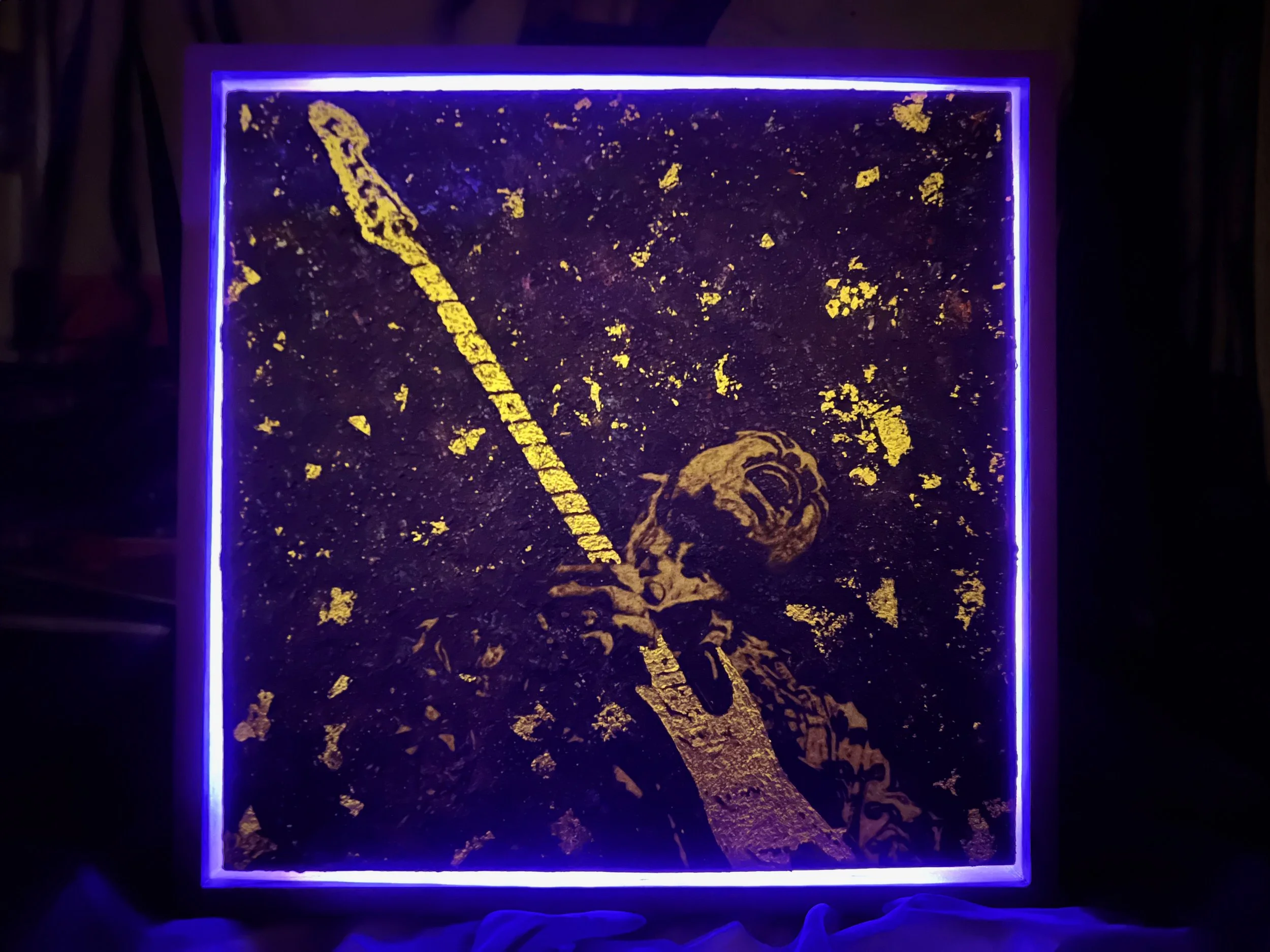Real gold leaf was added, providing a purity, whilst still maintaining the texture of the shredded wood. The gold also resides in the atmosphere around him, where he channels it through his own creative tool of choice, his guitar.